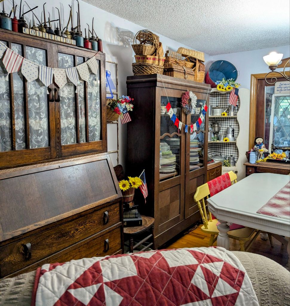 Things are a little crowded from this view. I need to move the smaller sewing cabinet, but I also need to display my vintage red Remington typewriter, especially for July 4th.