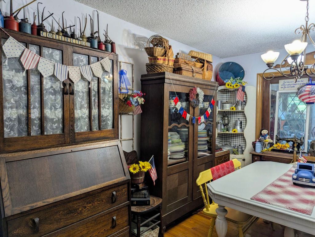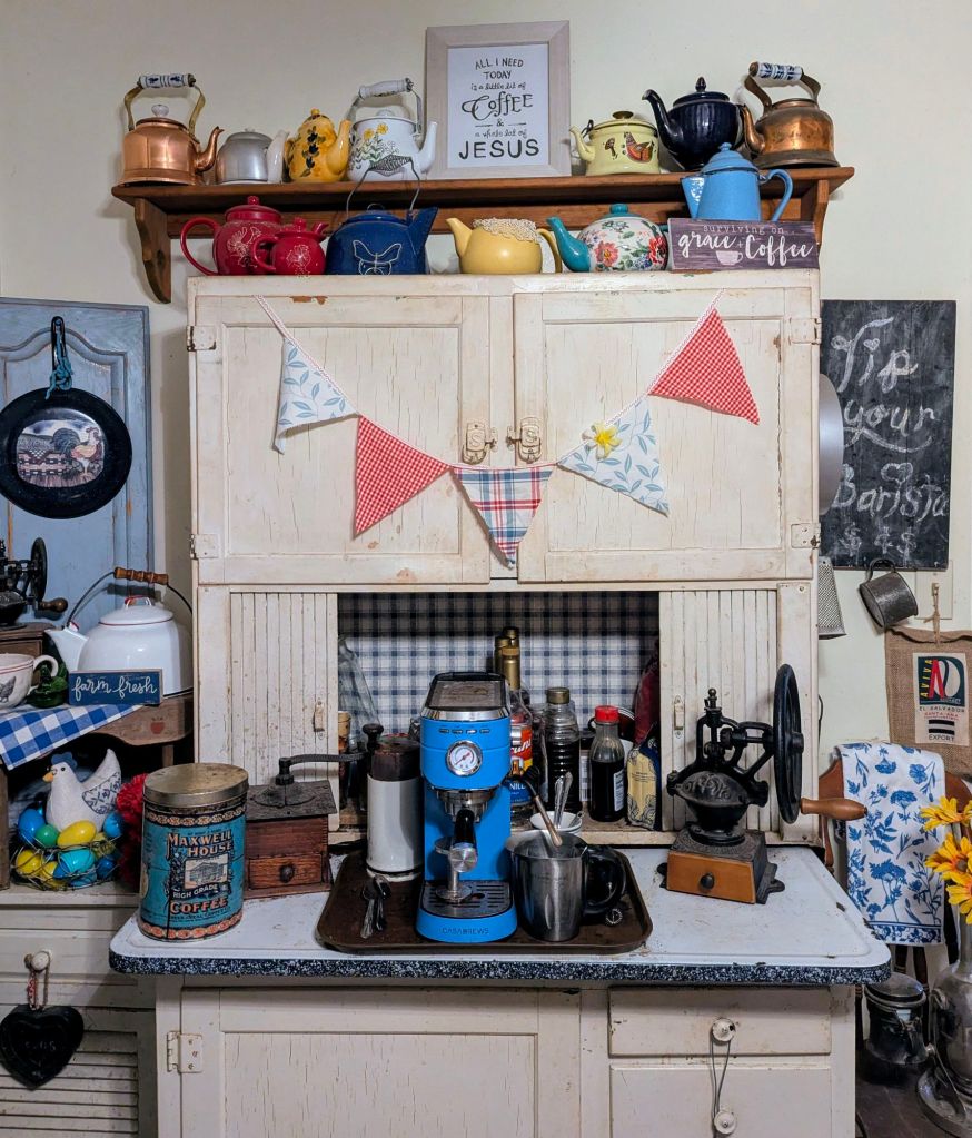 Our coffee bar needs a good cleaning. Don’t look too closely. This is a busy place in our house. My mom’s teapot and kettle collection is displayed here. I keep the collection growing. Homemade bunting in red, white and blue patterns adorns the Hoosier cabinet.