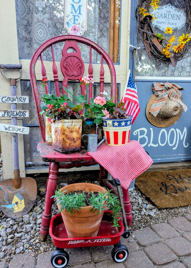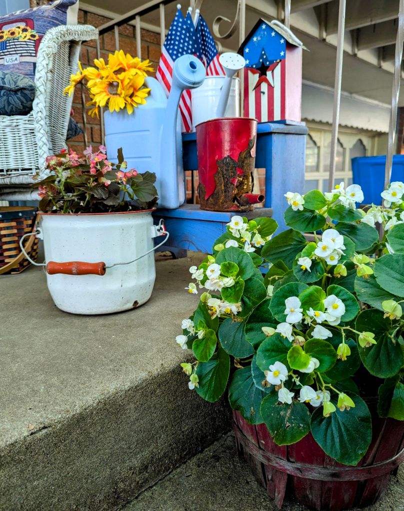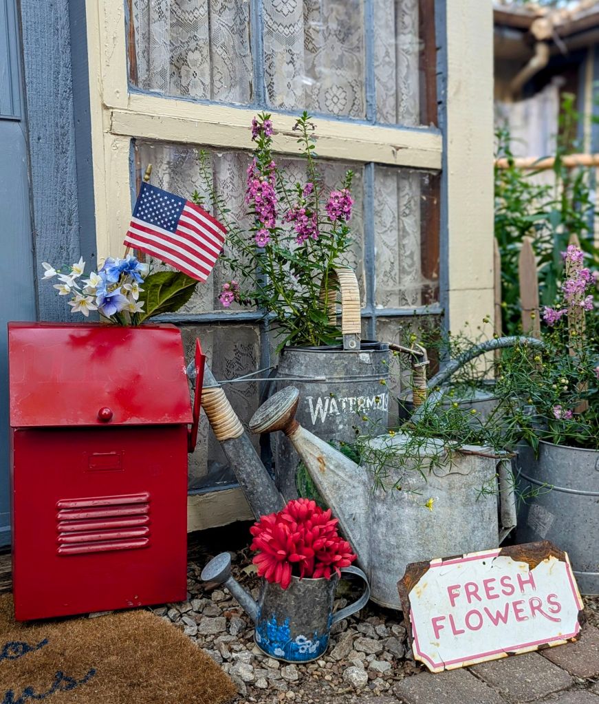 Red, white and blue watering cans, flags, and a patriotic birdhouse adorn this step stool. Using both real and faux flowers creates a pretty picture.