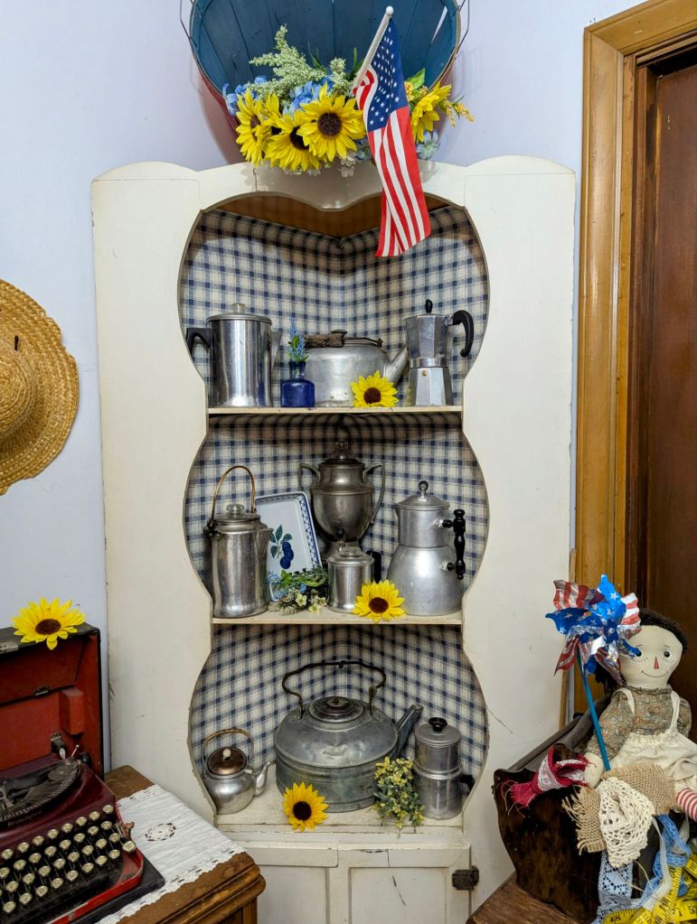 This cabinet was a $12 ReStore find. Once part of a built-in, it’s a bit worn, but adds to the charm of such a piece of furniture. I always line the back of the cabinet shelves with wallpaper or wrapping paper, except at Halloween… the back boards are a bright orange! This cabinet is perky with all of the coffee percolators. A hanging flag is all she needs.
