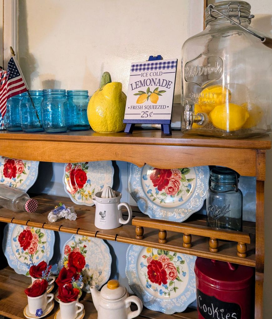 The summer theme for this ol’ hutch is a backyard picnic. I’ve used red, white and blue for the color scheme, but also added in some yellow with sunflowers and lemons. Just one flag is all it takes. The mason jar is full of red, white and blue straws as well.