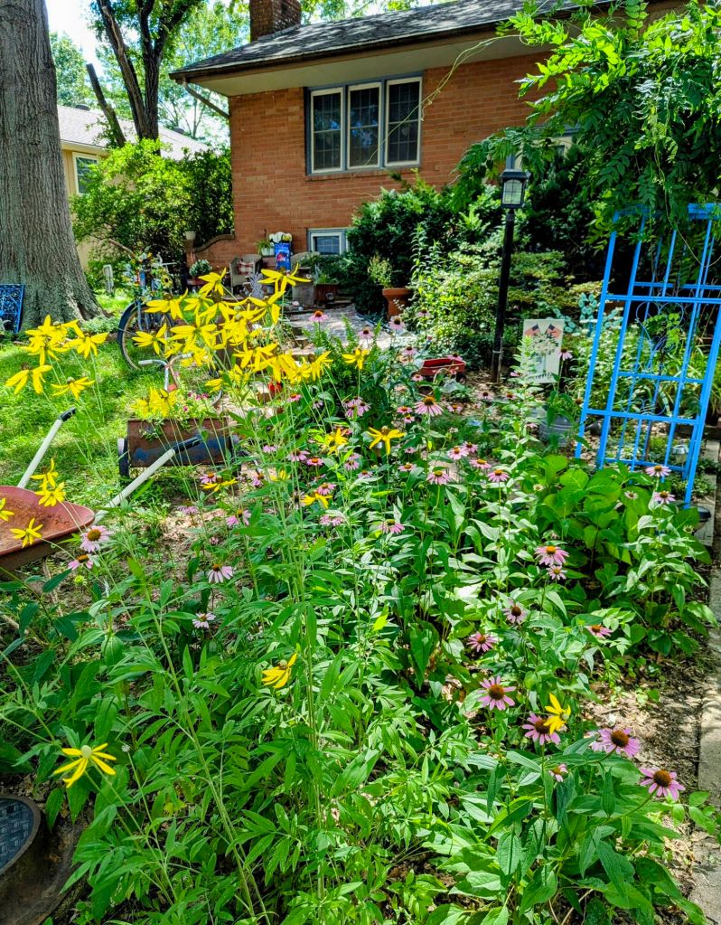 Wildflowers are blooming! The whimsical cottage arbor is painted Wildflower blue and is covered with Wisteria vines. They’ve yet to bloom though; maybe it’s too shady.