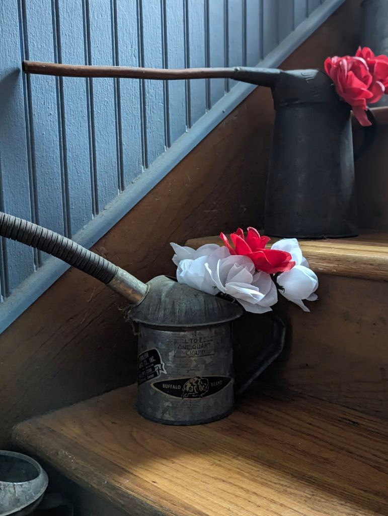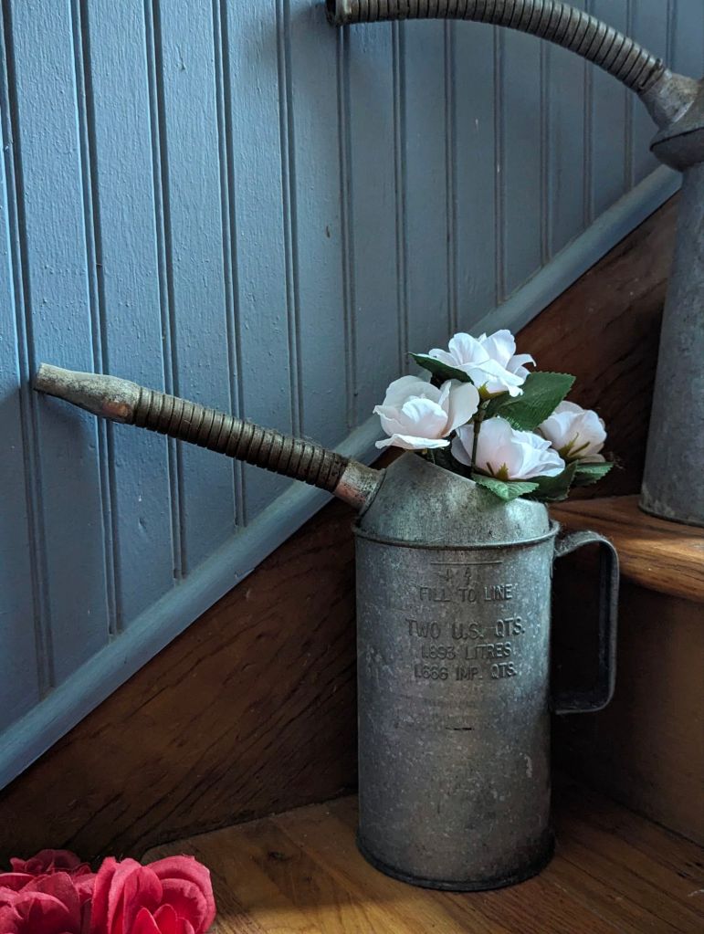 My husband collects oil/gas cans. I display them on the stairs leading to his garage/workshop. They’re even more beautiful adorned with flowers.