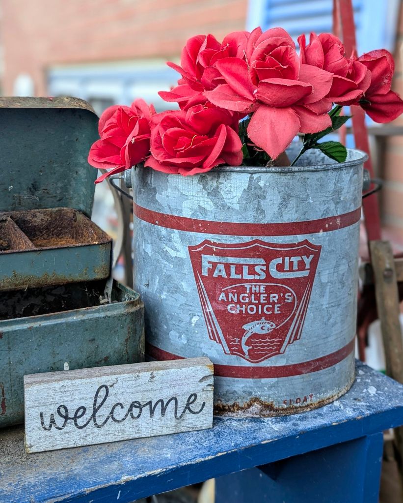 Roses mixed with rusty fishing gear are a beautiful sight. My husband and I are collectors, so I use our collections when decorating.