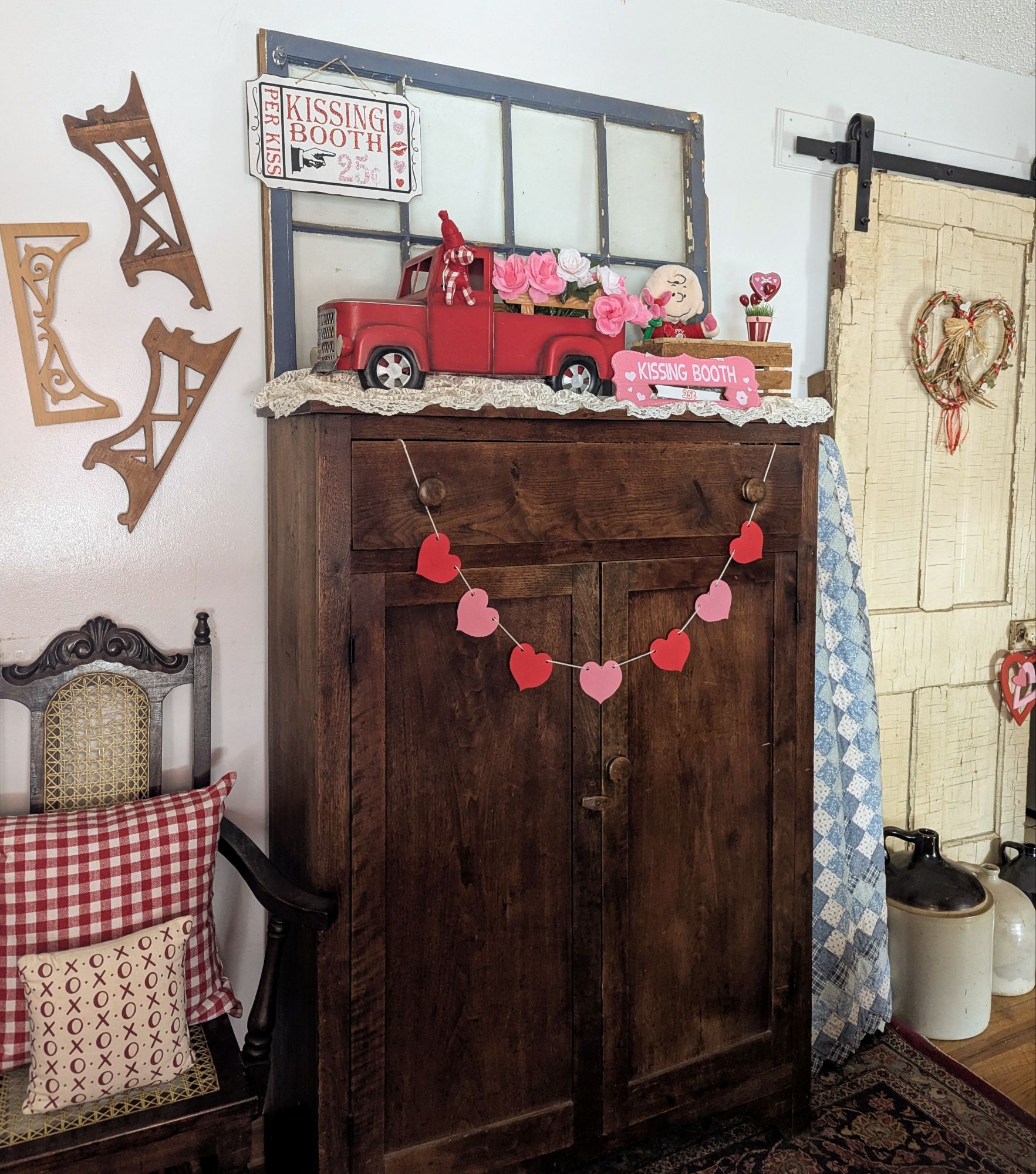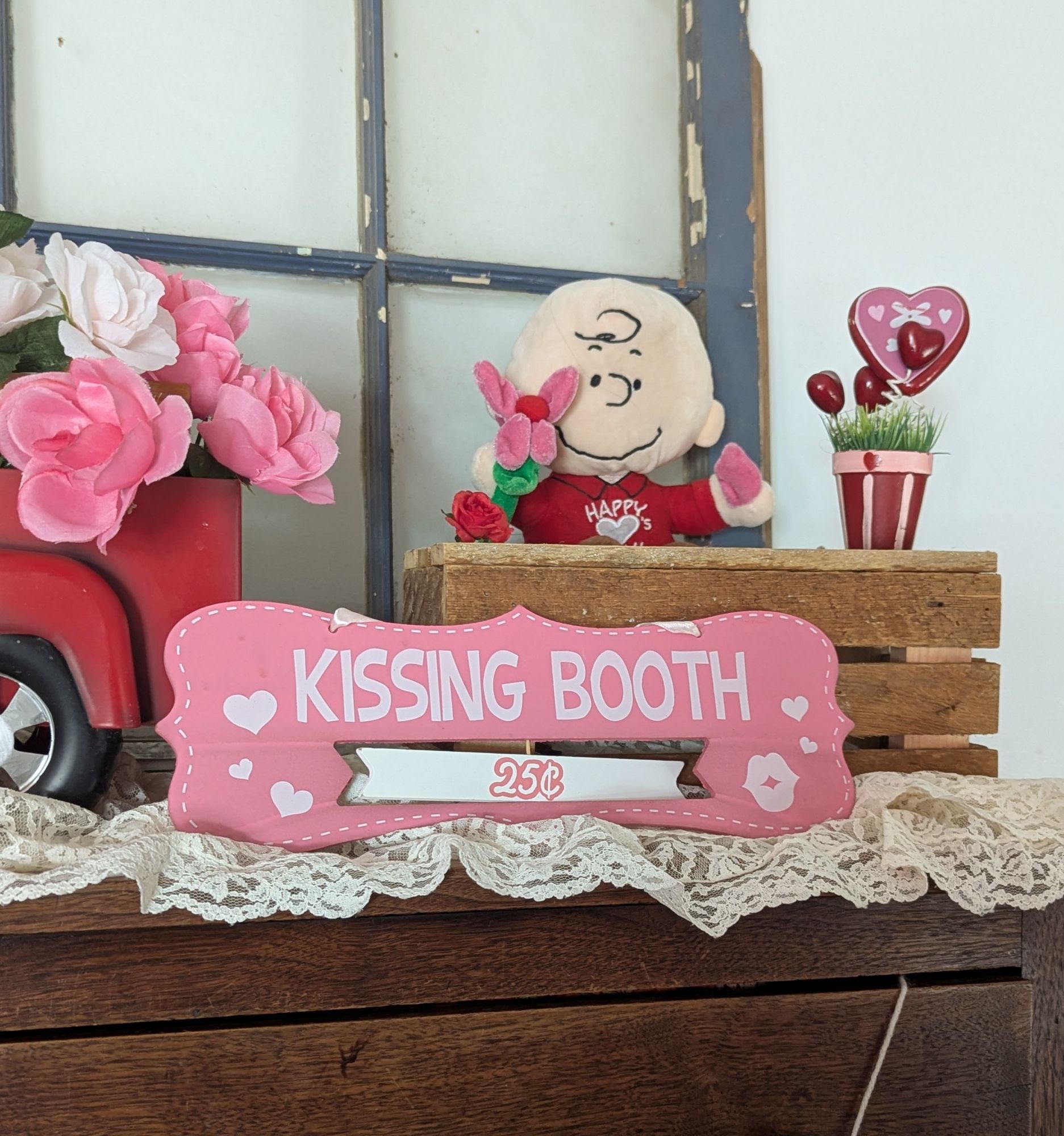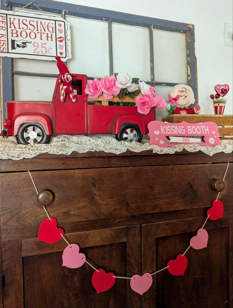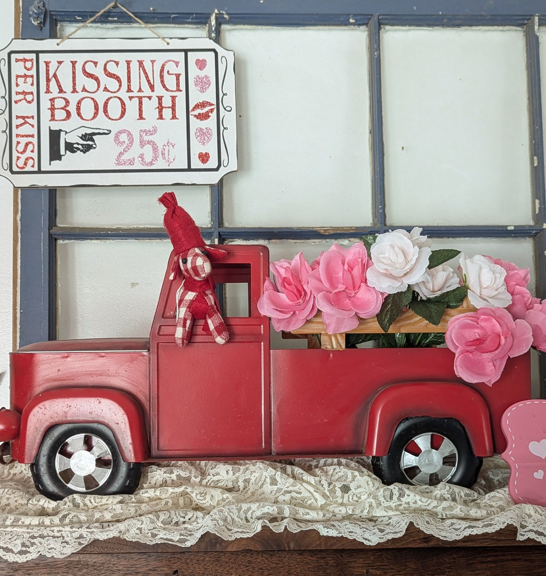 This vignette is one of my favorite new creations, a kissing booth. 💋 A heart garland definitely adds a festive touch.