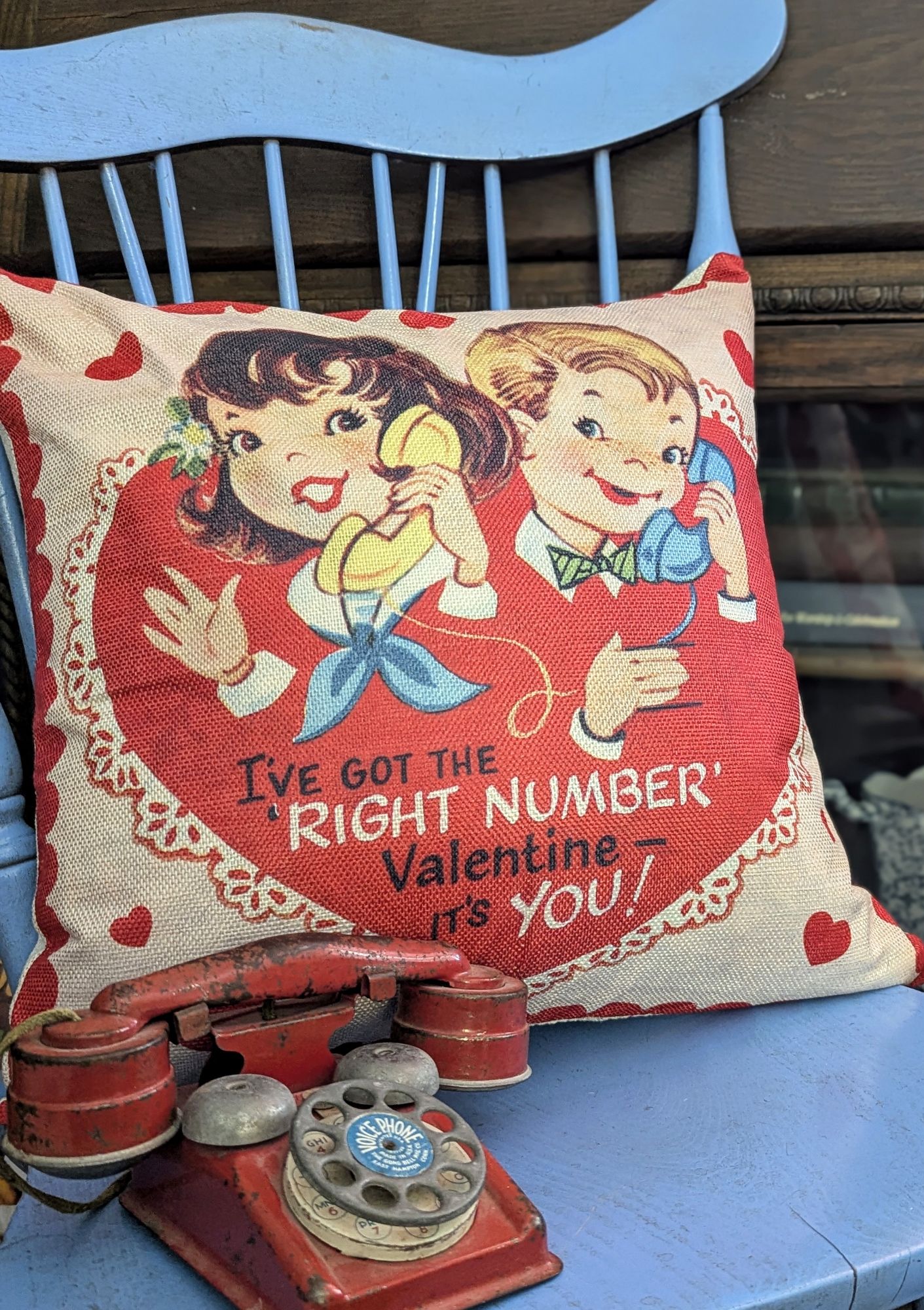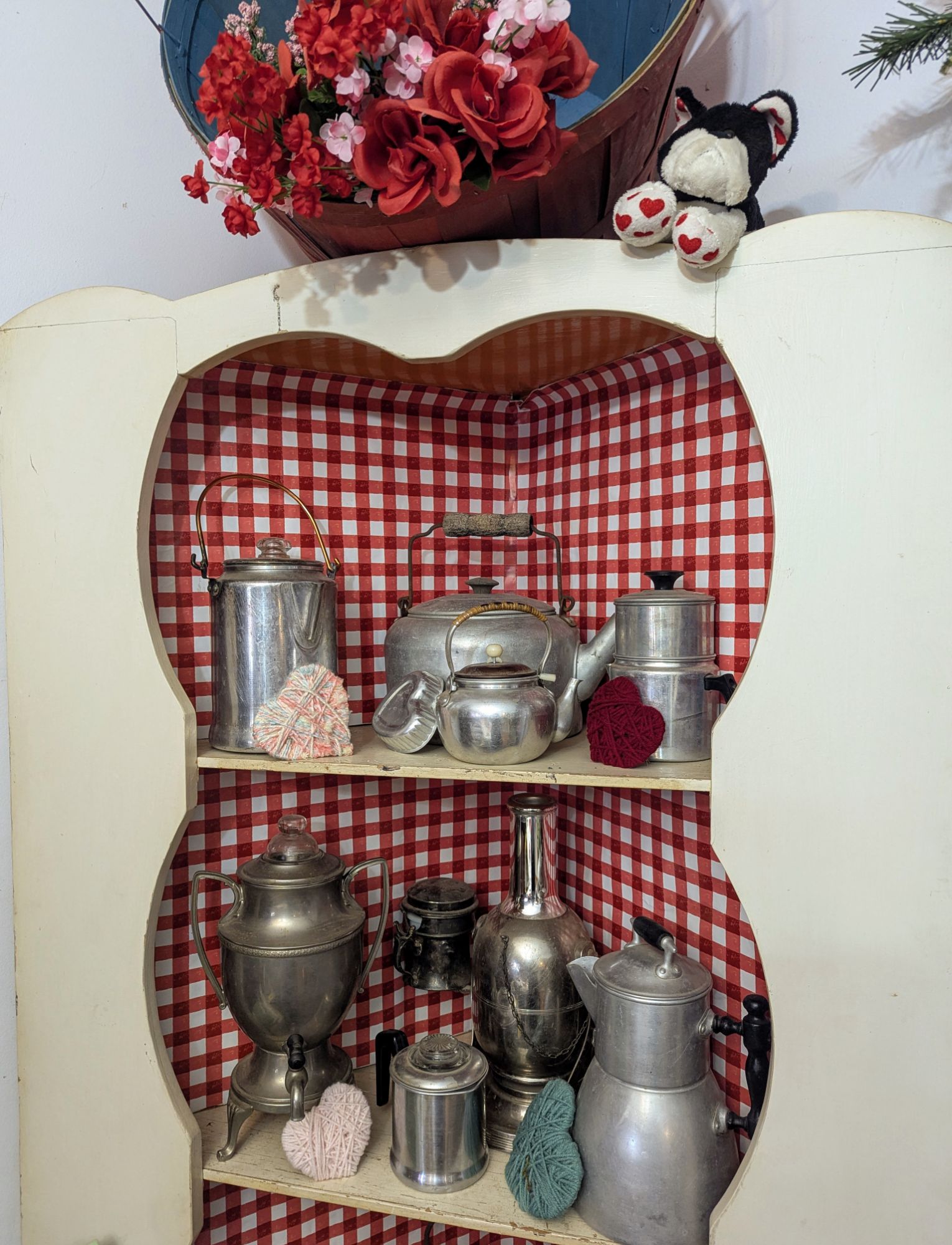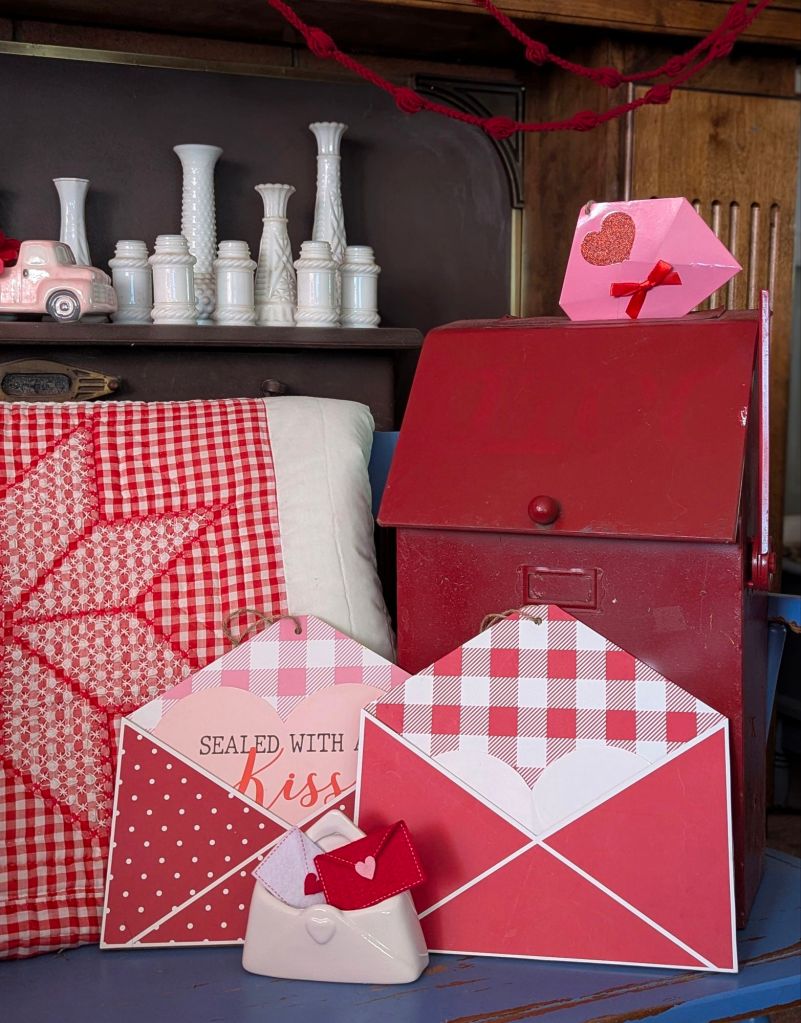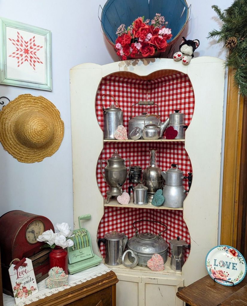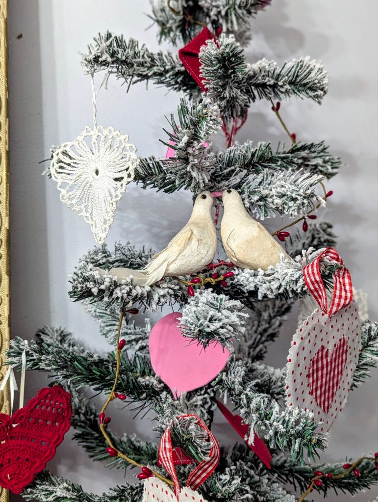 This vignette is one of my favorite new creations, a kissing booth. 💋 A heart garland definitely adds a festive touch.