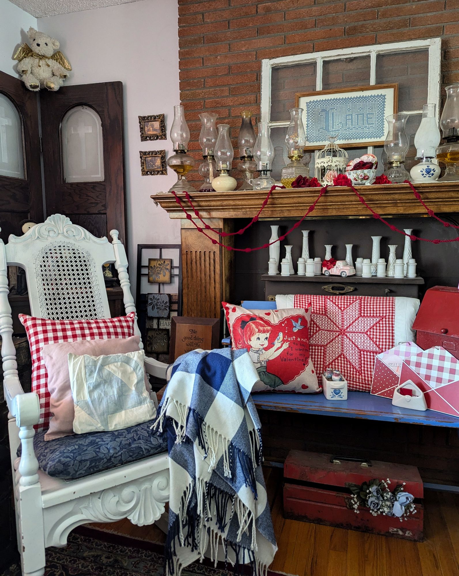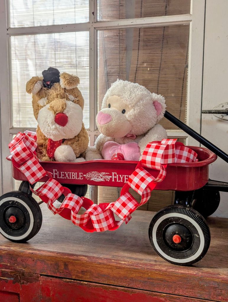 My mom-in-love used to give my youngest daughter stuffed animals for Valentine’s Day. I like to incorporate them into decorating. Using them year after year spreads the love! The red check chain swagged on the wagon is a diy made from wrapping paper, so easy!