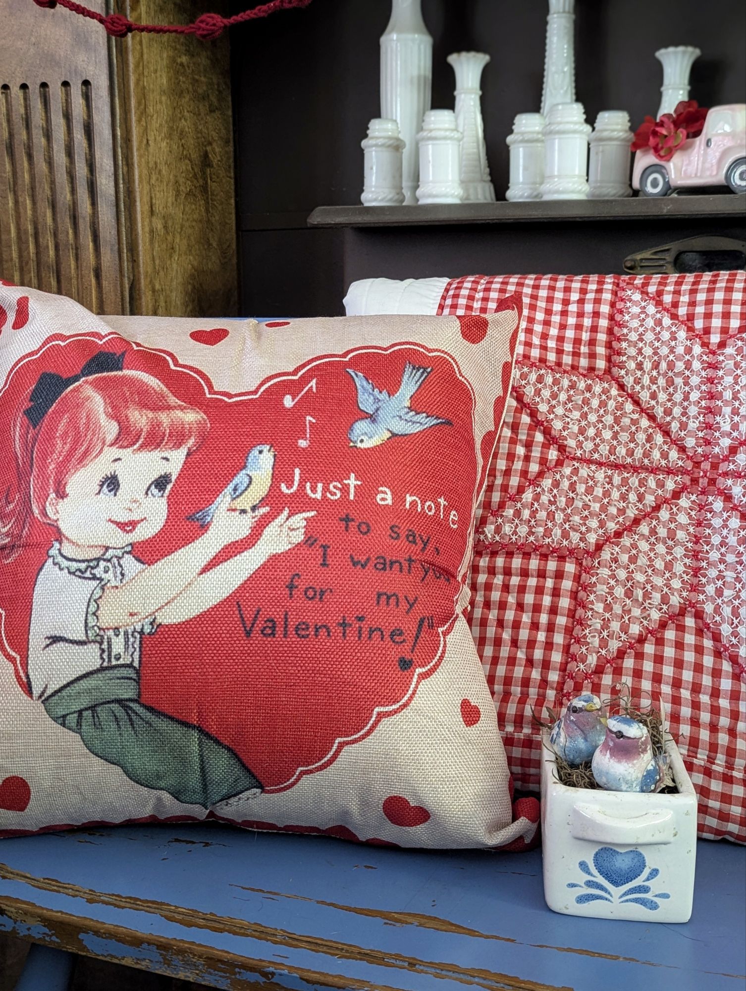 Pillow covers inspired by vintage Valentine cards are wonderful for creating loving vignettes. The ceramic drawer with nesting birdies was from a neighbor at our previous home.