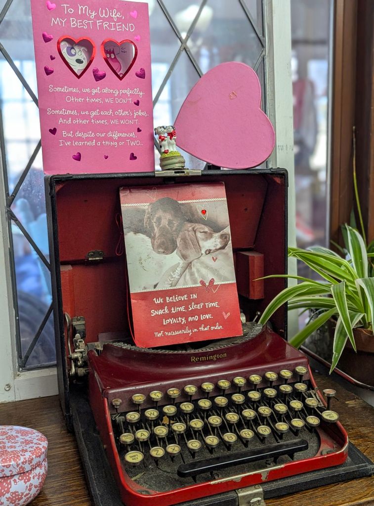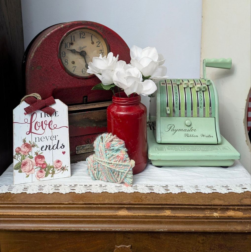 This old Remington typewriter was a ReStore score. I use it to romantically reminisce displaying the first Valentine card from my husband.