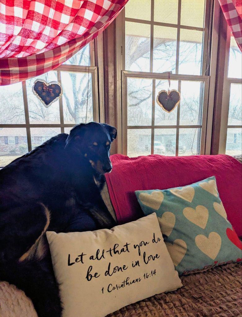 Nala Bear is modeling a couple Valentine pillows. Pillows and pillow covers add coziness to our living room. Pillow covers are inexpensive and easy to store. I like to change out the pillows for each season. Notice the handmade fabric hearts hanging in the windows, a loving touch.