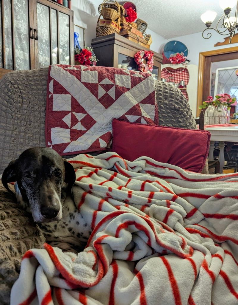 Katie Mae is modeling a comfy cozy throw blanket in red and white. Throw blankets and quilts are a wonderful way to incorporate Valentine colors into a home’s decor. Plus, they’re an invitation to snuggle!