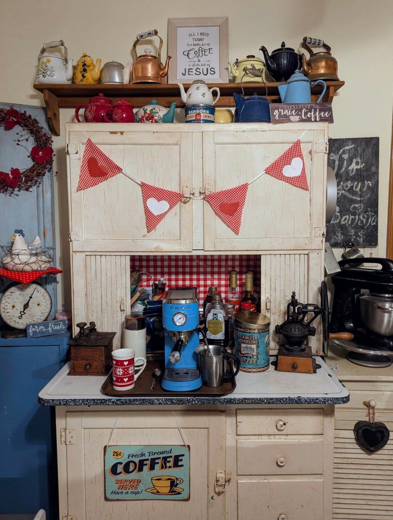 Homemade gingham and hearts bunting and Pioneer Woman wallpaper transform this busy coffee bar into a happy cheerful place to start each morning.