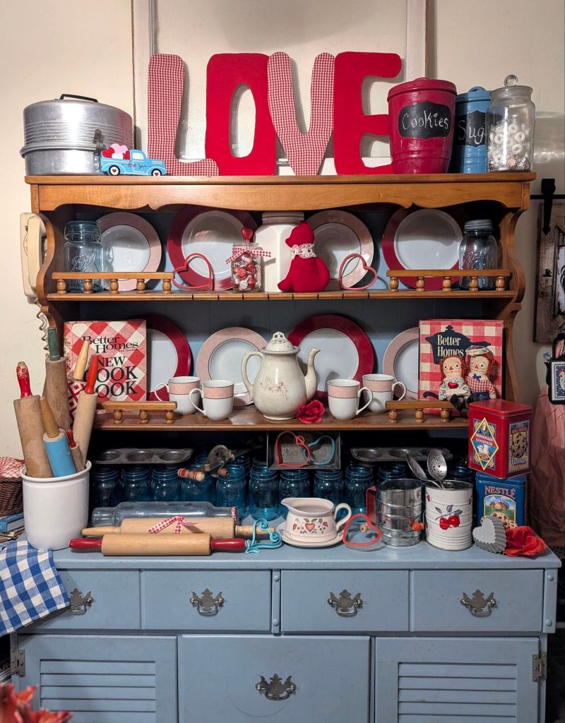Gifts, souvenirs from adventures, meaningful vignettes, messages, saved cards, vintage goodies and handmade treasures… these are all wonderful things to use in decorating for Valentine’s Day with the message of I Love You