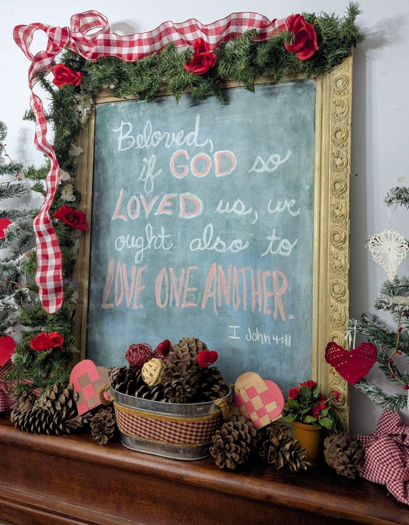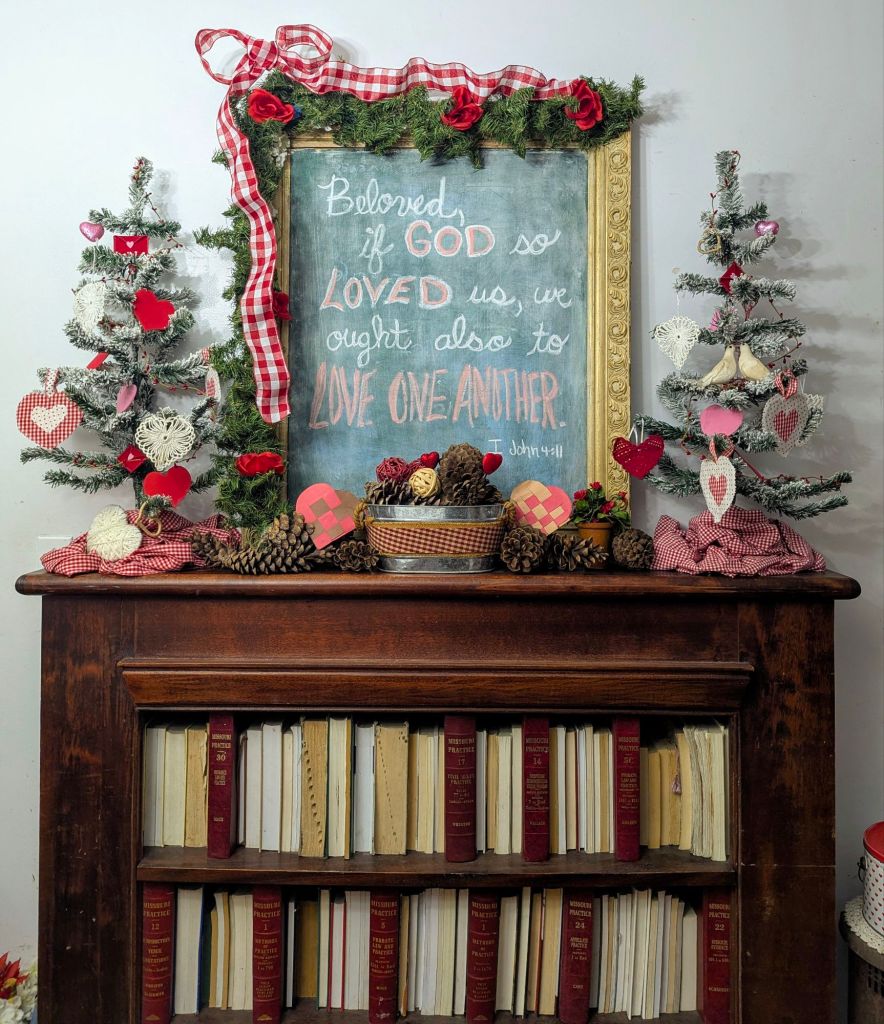 “LOVE ONE ANOTHER.” My youngest daughter made the 2 woven hearts many years ago in elementary art class. They’re lovingly placed on the bookcase mantel.