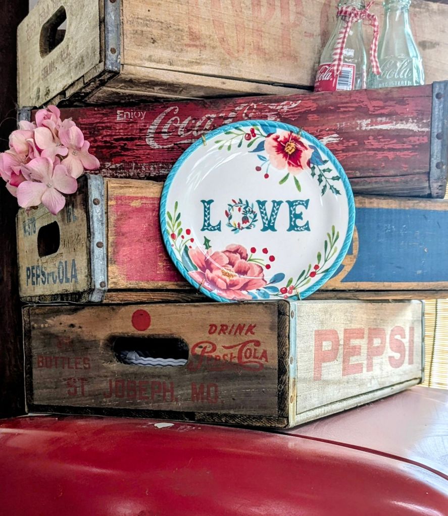 Valentine vignettes using what you already own can be special Valentine displays. The colors on this plaque, red, pink and mint green, tie it all together.